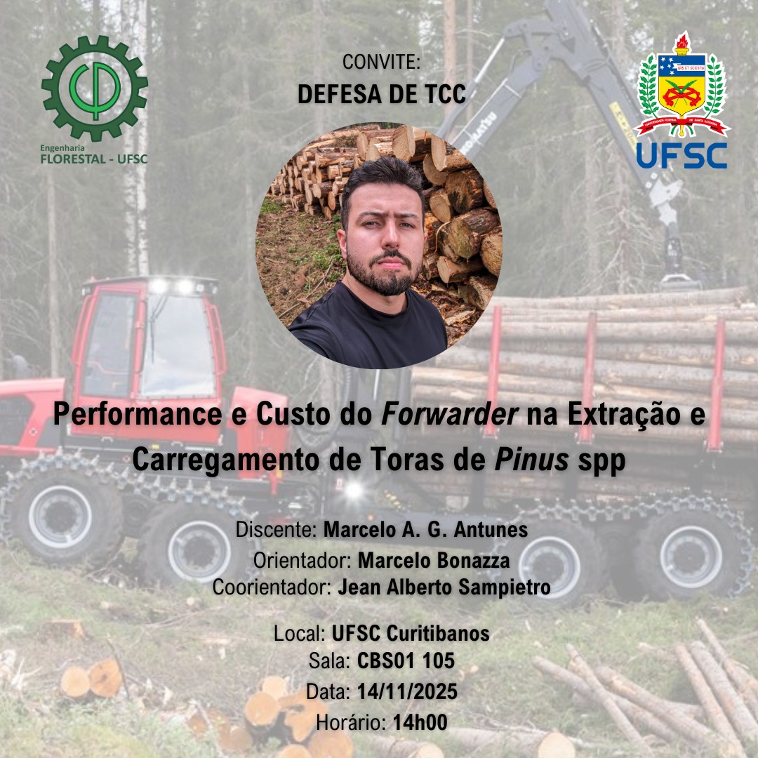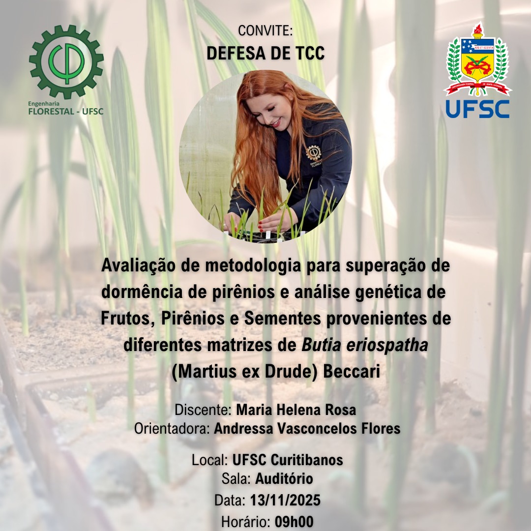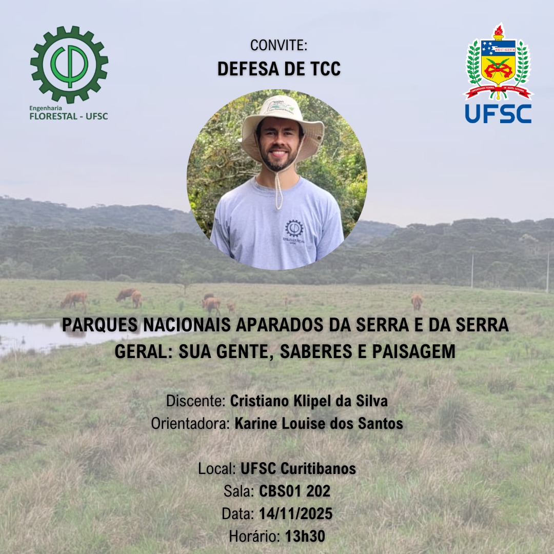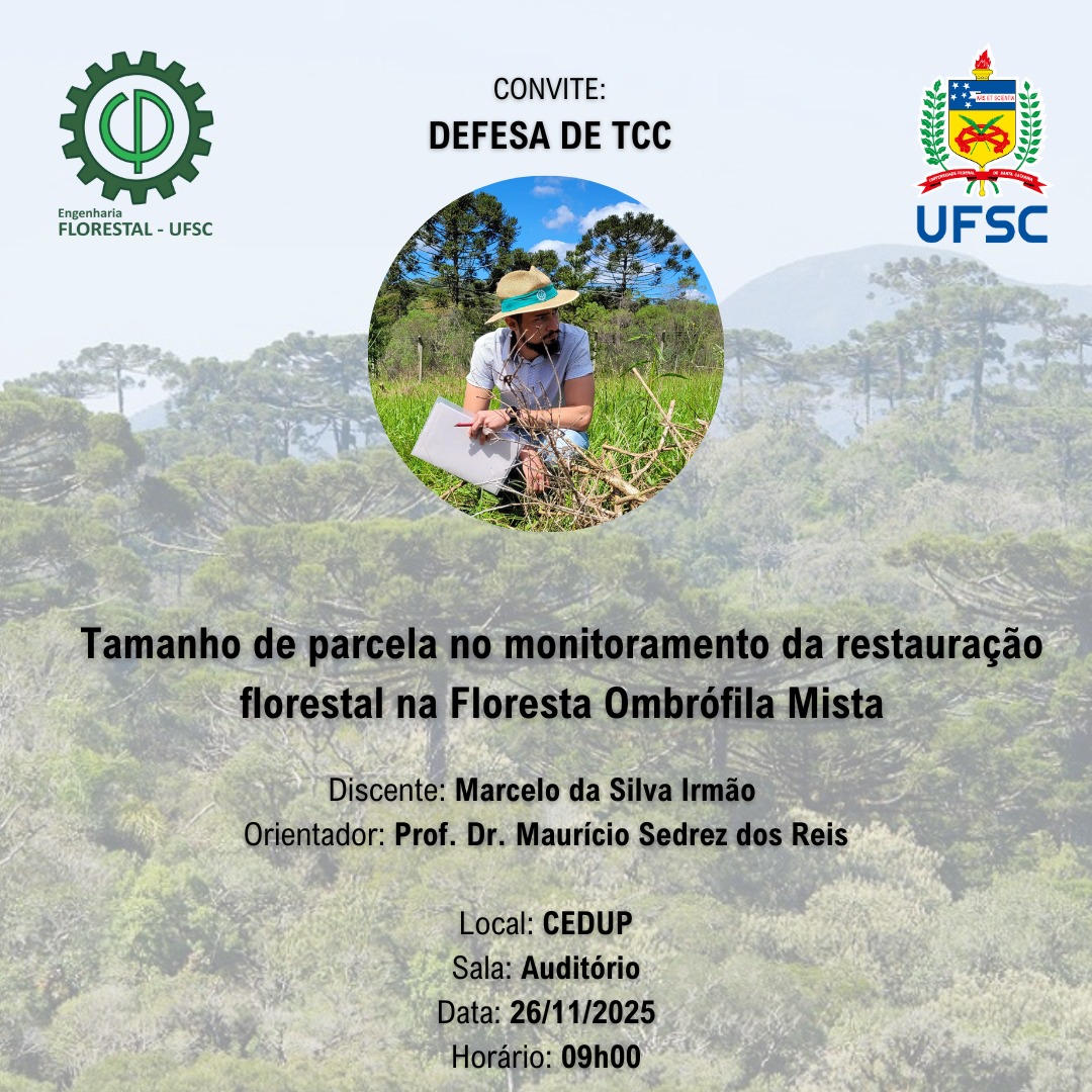 Inscrições: 27/05 a 05/06, sendo que os documentos devem ser enviados por e-mail do Curso (engenharia.florestal@contato.ufsc.br).
