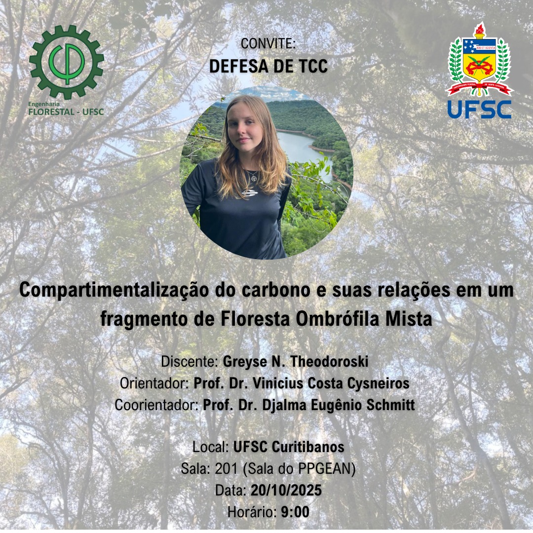 Inscrições: 21 a 30/10, sendo que os documentos devem ser enviados por e-mail do Curso (engenharia.florestal@contato.ufsc.br).